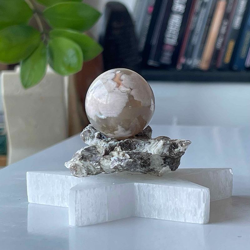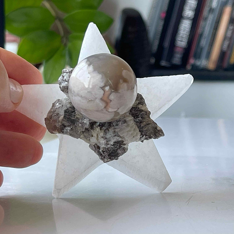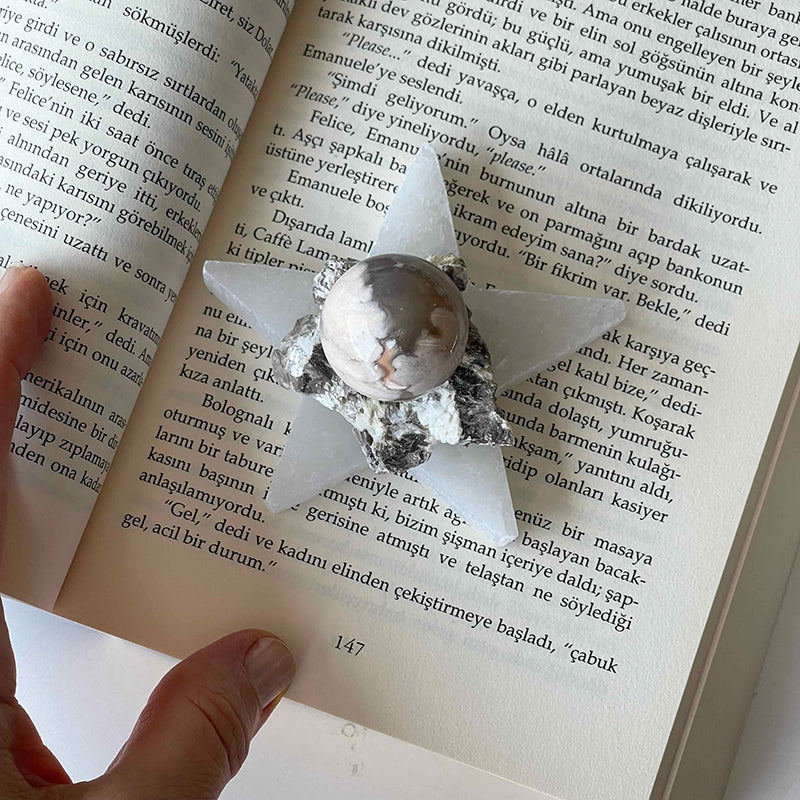 Bu dekoratif çalışma, yıldız formunda Selenit ile başlar. Selenit, ışığı, berraklığı ve ruhsal aydınlanmayı temsil eder. Yıldızın üzerinde yer alan ham Lepidolite, sakinlik ve duygusal denge sağlama gücüyle bilinir. Şifa taşı olarak tercih edilir. En üstte yer alan küre formunda Çiçek Akik ise yaşamın döngüselliğini ve doğal güzelliklerin sonsuzluğunu simgeler. Aynı zamanda bulunduğu ortamdaki negatif enerjileri temizler.