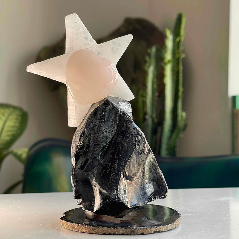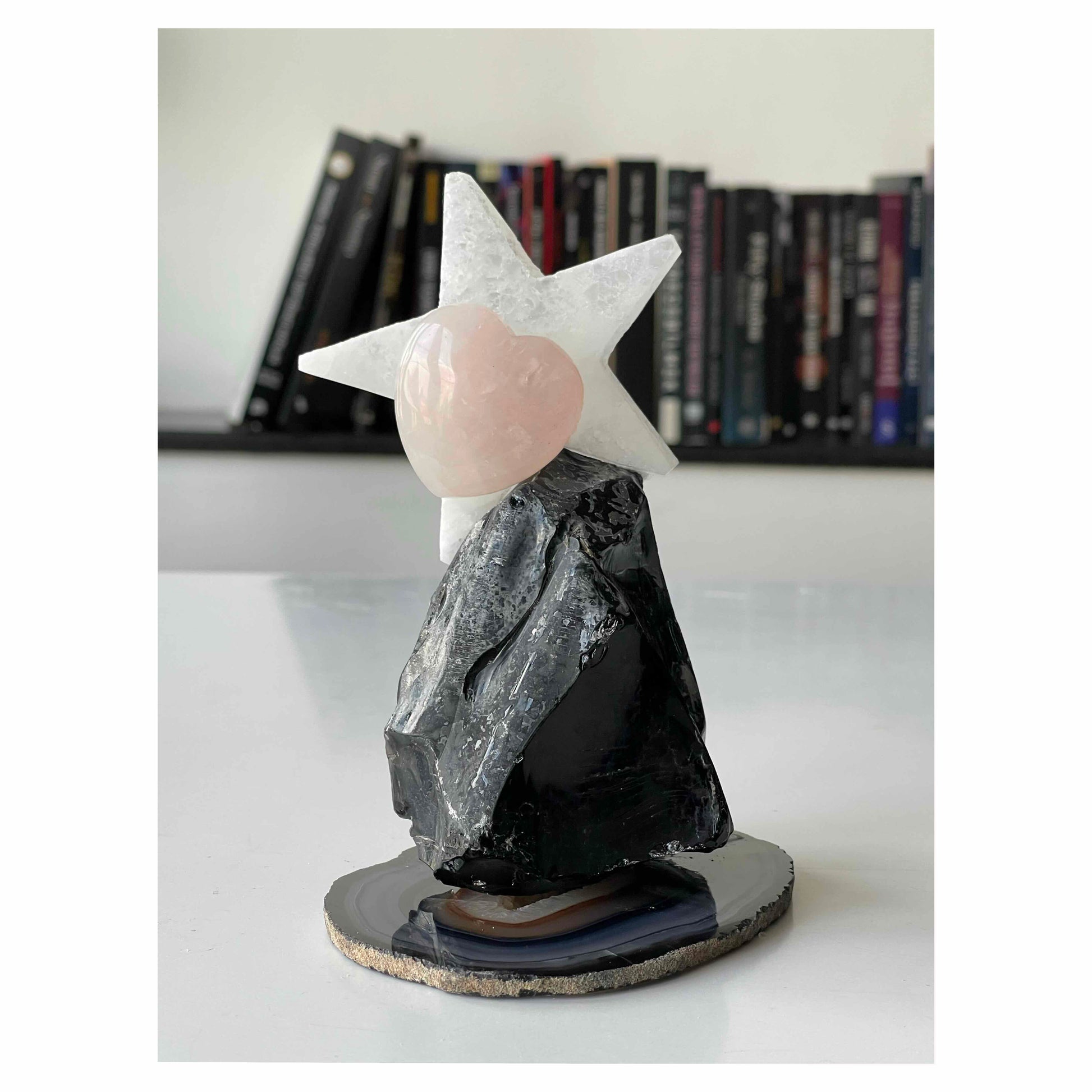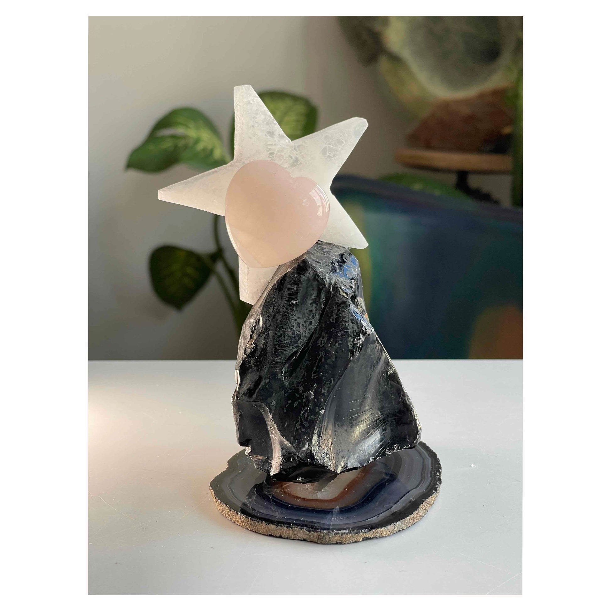 Akik kristali üzerinde ham Obsidyen ve üstünde yıldız formunda Selenit ile kalp formunda Pembe Kuvars kristalleri.