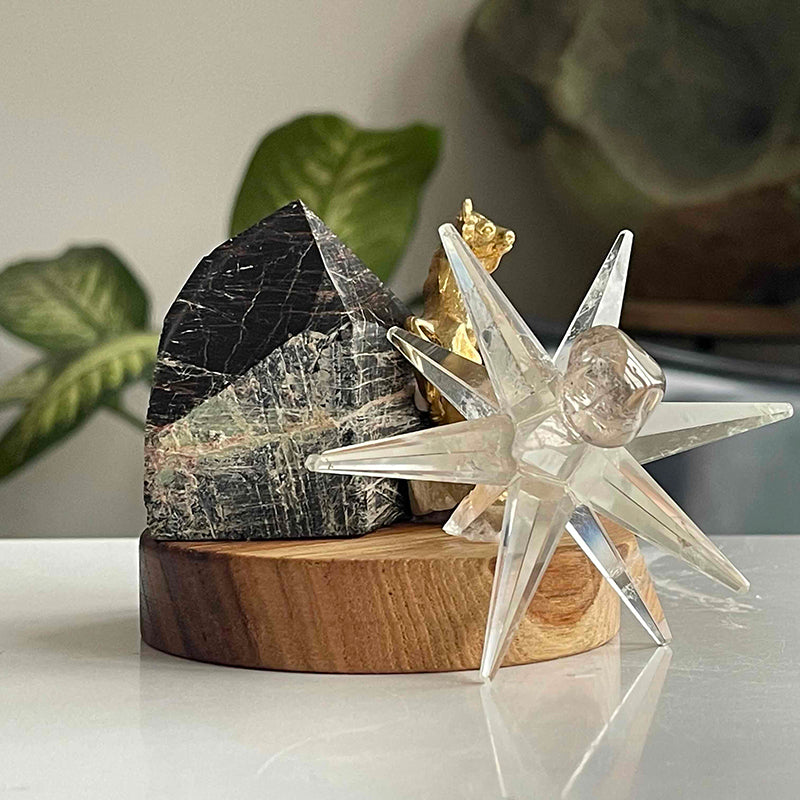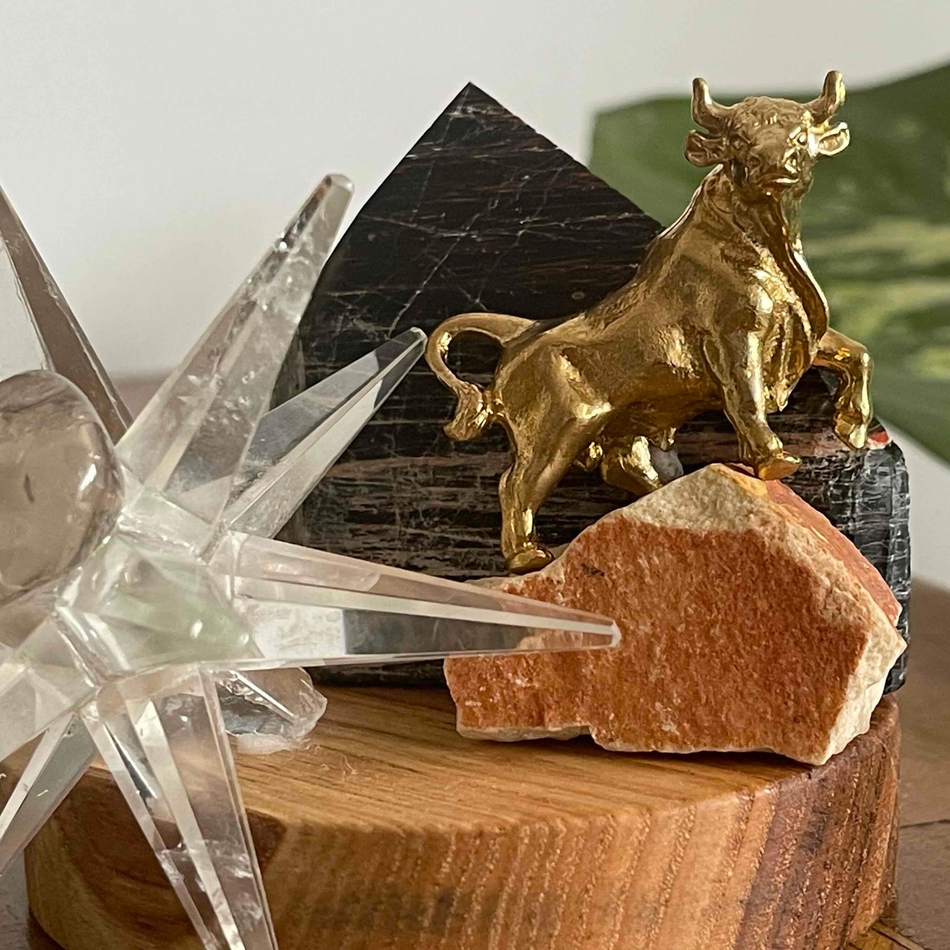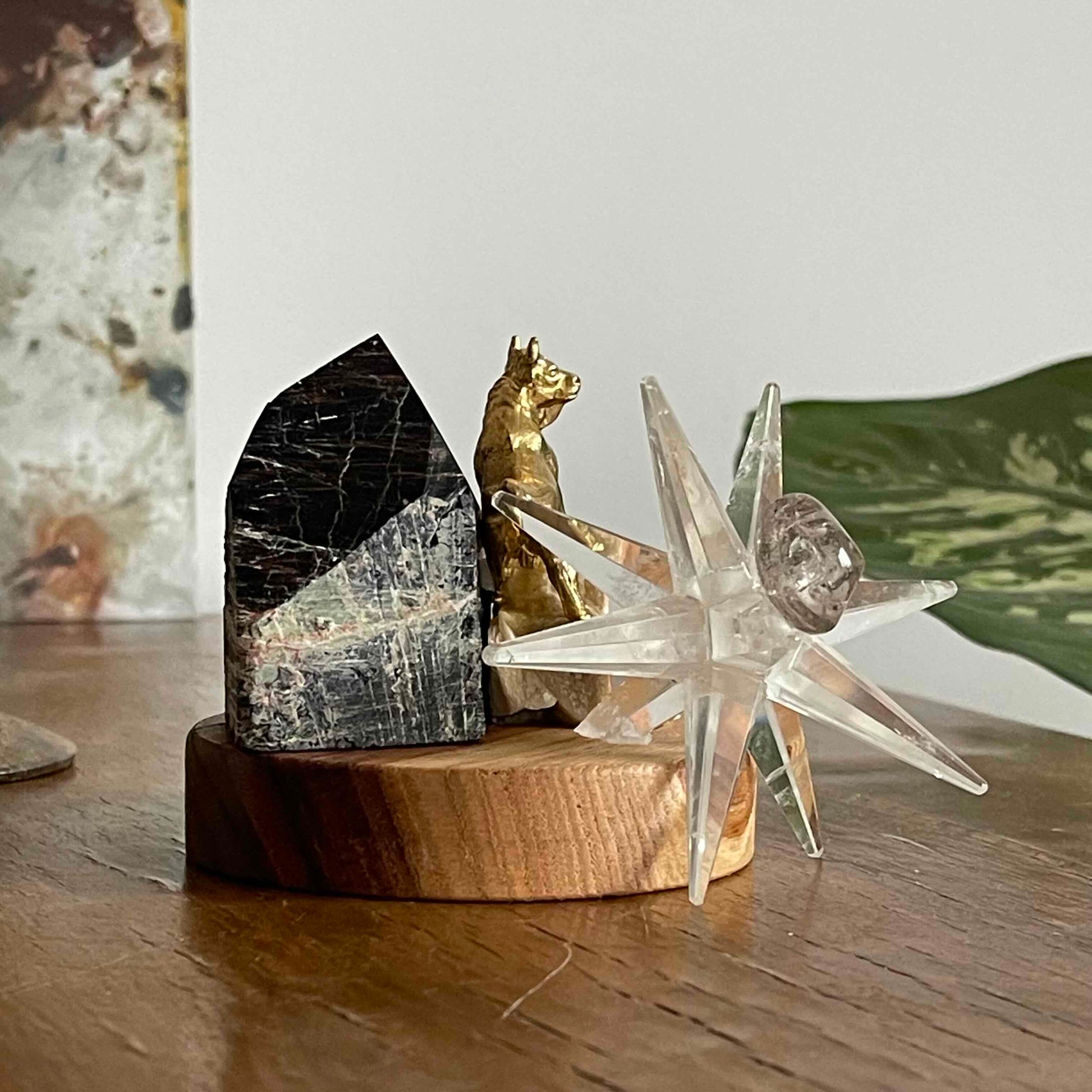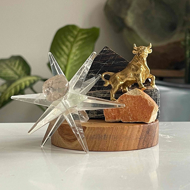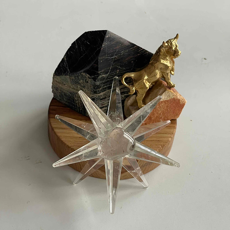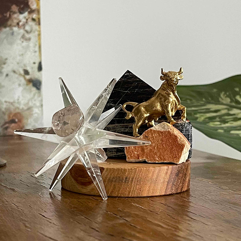 Ahşap kaide üzerinde Piramit formunda Turmalin, cesaretin ve gücün sembolü pirinç Boğa figürü ve yıldız formunda Kristal Kuvars. Bu çalışma, kişiye içinde saklı cesaret, gücünü hatırlatırken, yıldızının parlamasına destek vermesi ilhamıyla hazırlandı.