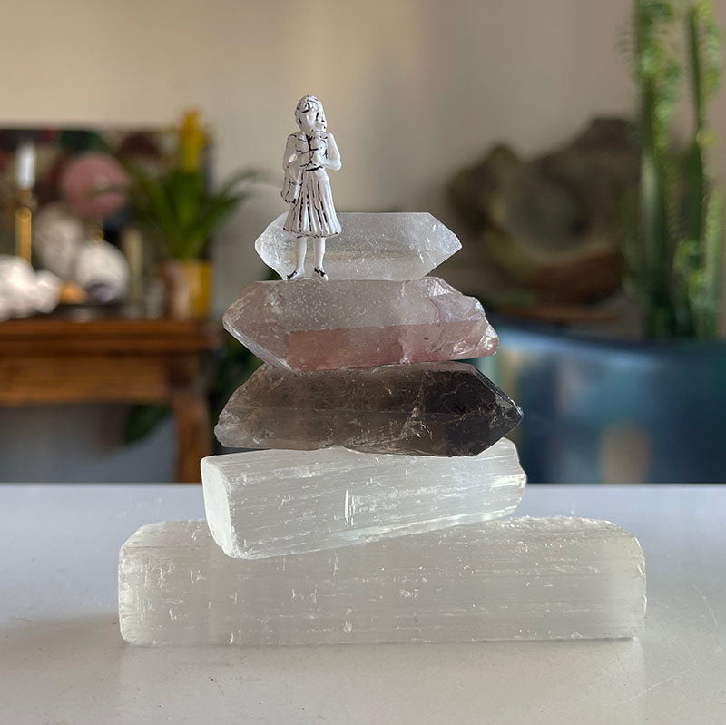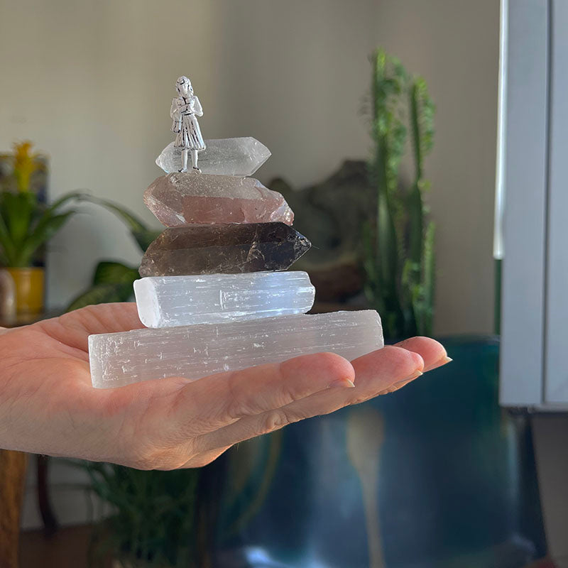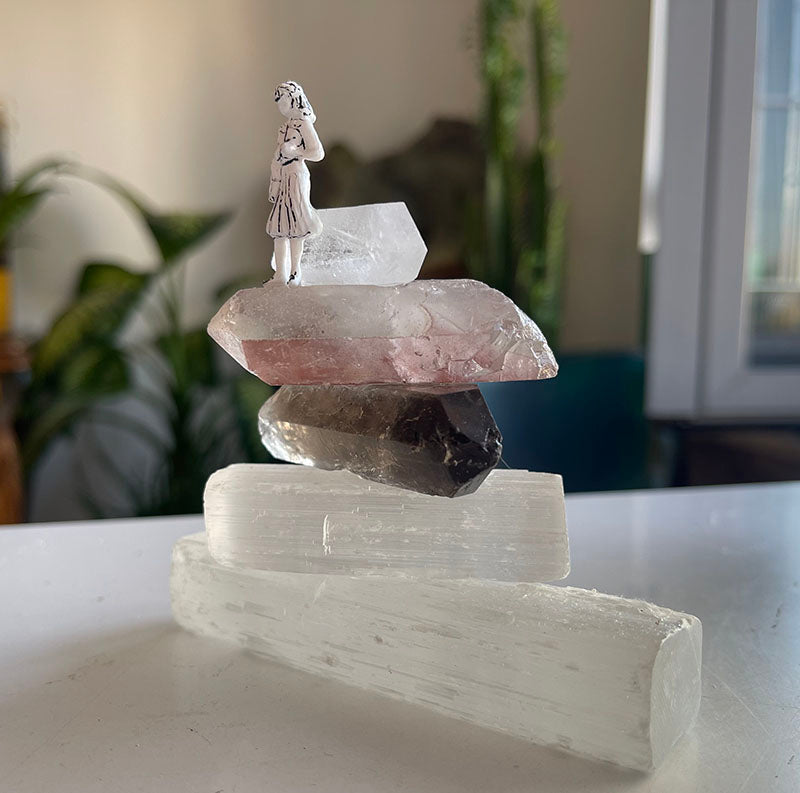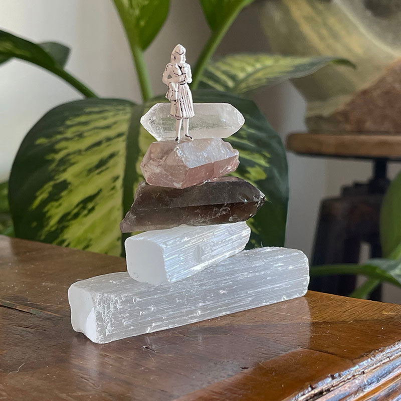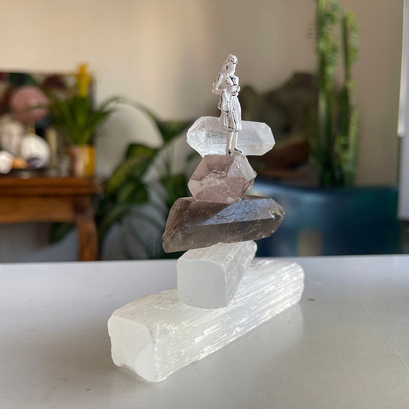 Bu zarif heykel, Selenit kristalleri üzerine dizilmiş Dumanlı Kuvars ve Kristal Kuvars taşları ile ruhsal bir merdiven oluşturur. Merdivenin zirvesinde duran kadın figürü, içsel yolculuğunu tamamlayarak ruhsal bir yükselişi geçişi temsil eder. Her basamak, spiritüel gelişimin bir aşamasını sembolize eder.