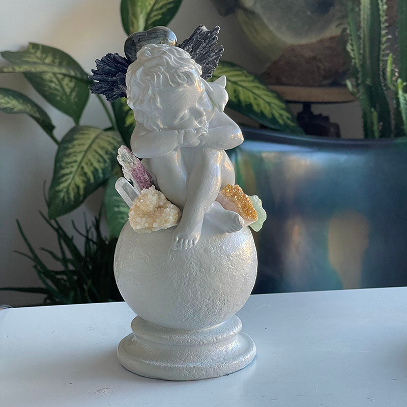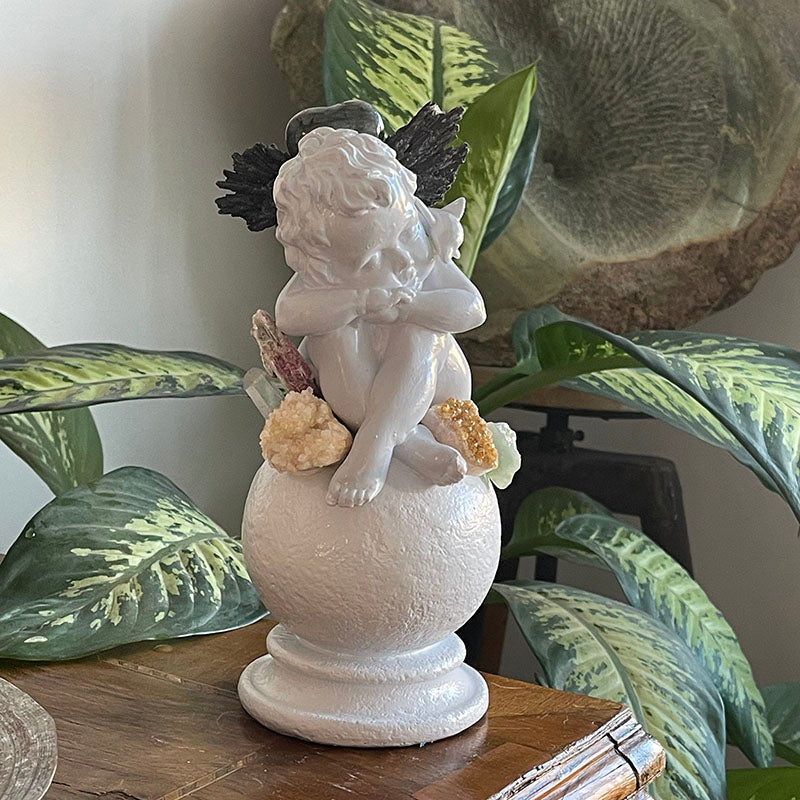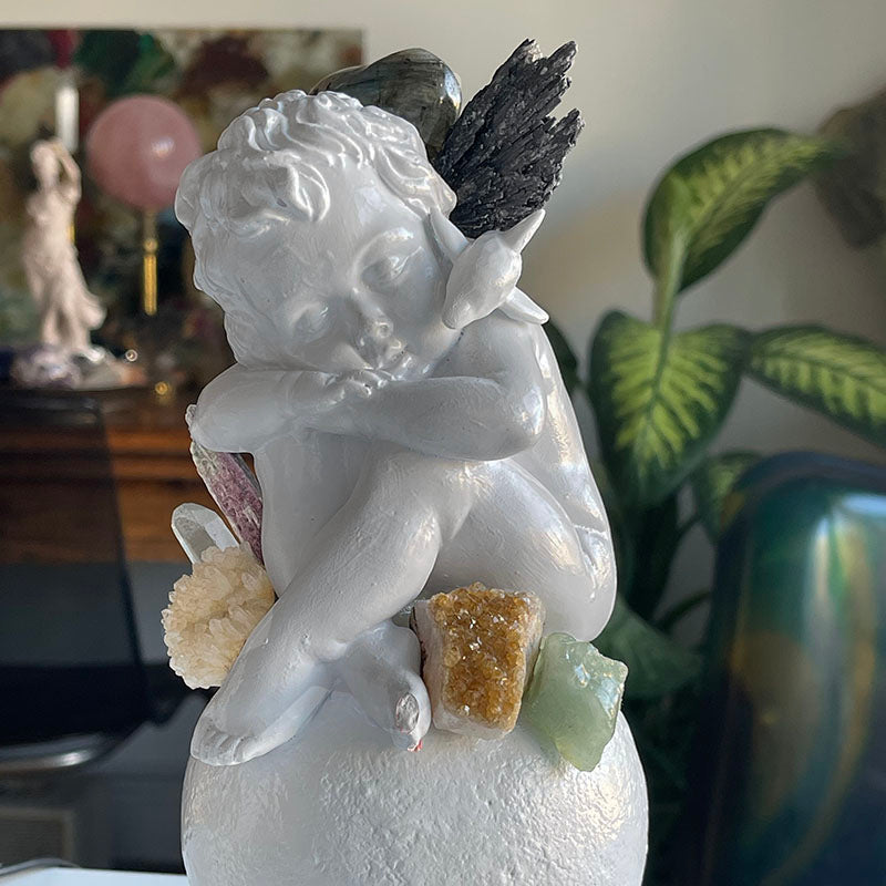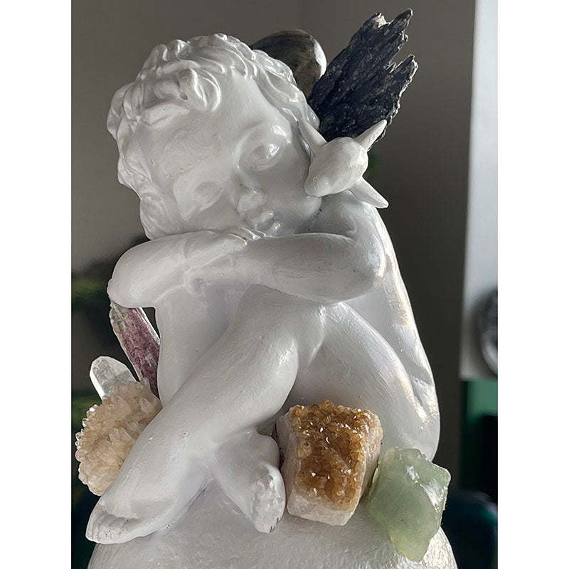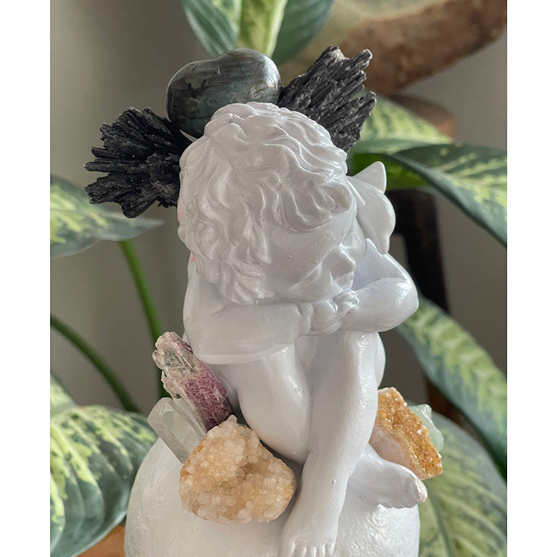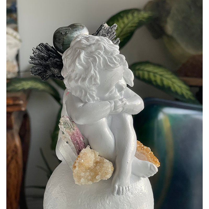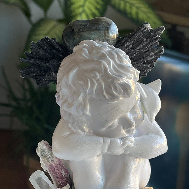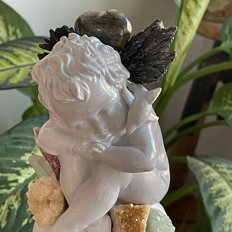 Meleğin Kyanit taşlarından oluşan kanatları arasında yer alan Labradorit taşından kalp, saf sevginin ve içsel ışığın temsilcisidir. Meleğin üzerinde dinlendiği küre, Pembe Turmalin, Kristal Kuvars, Sitrin ve Akuamarin taşlarıyla bezenmiştir.