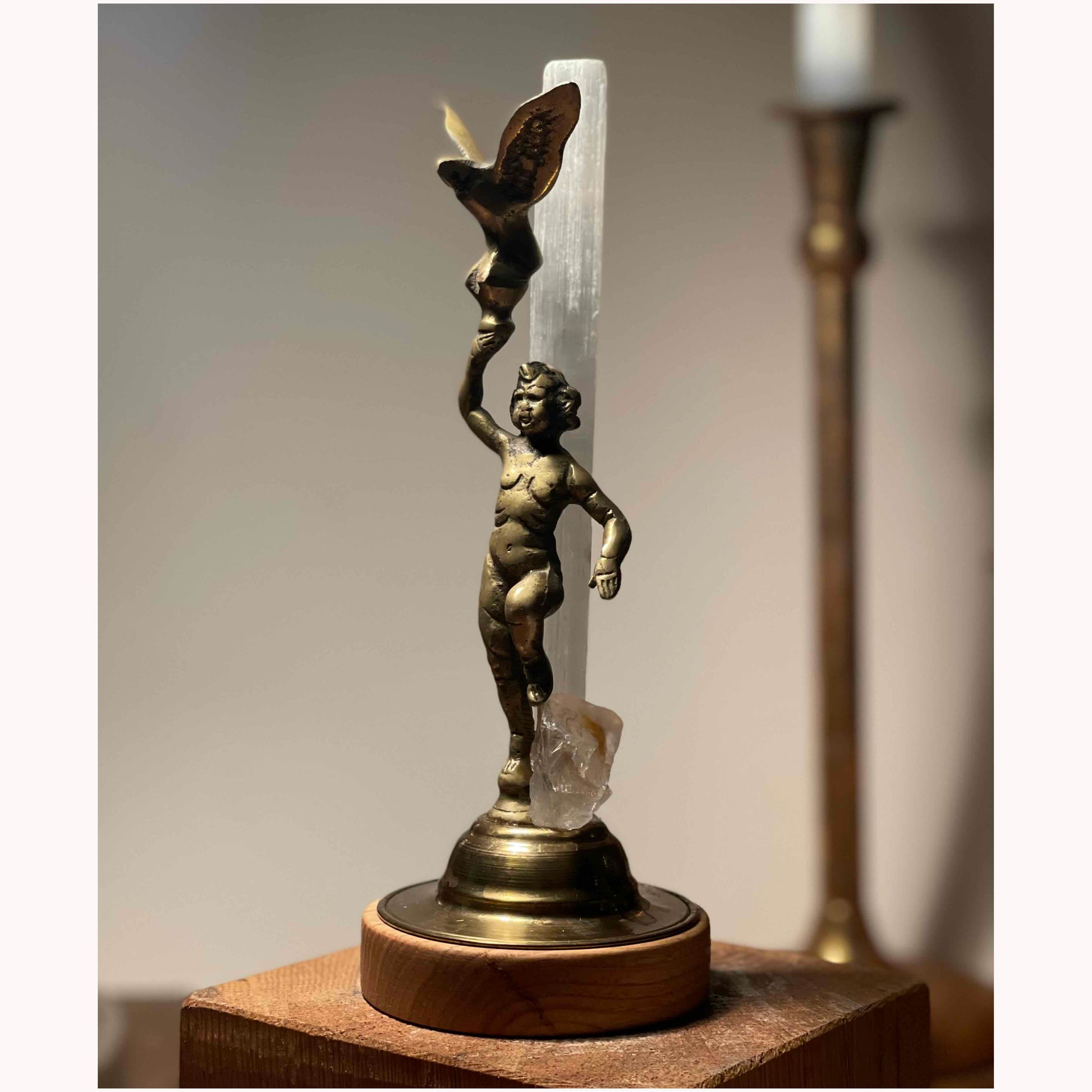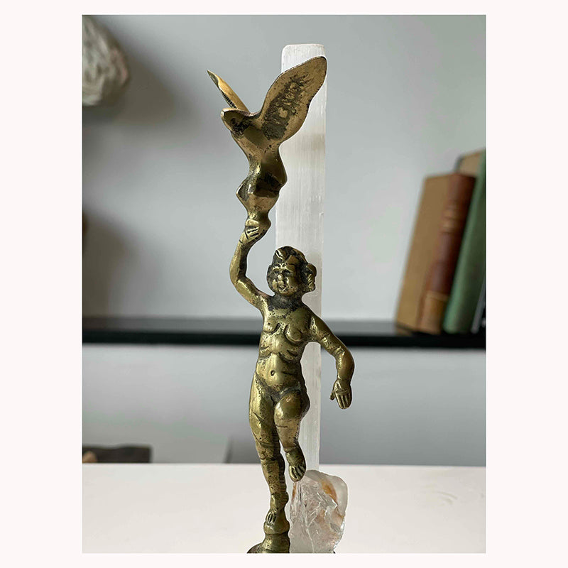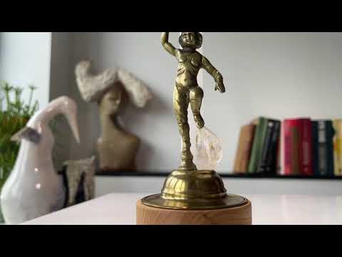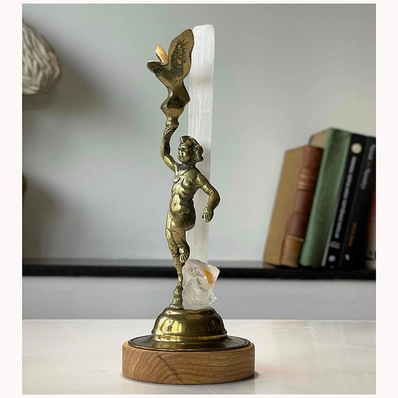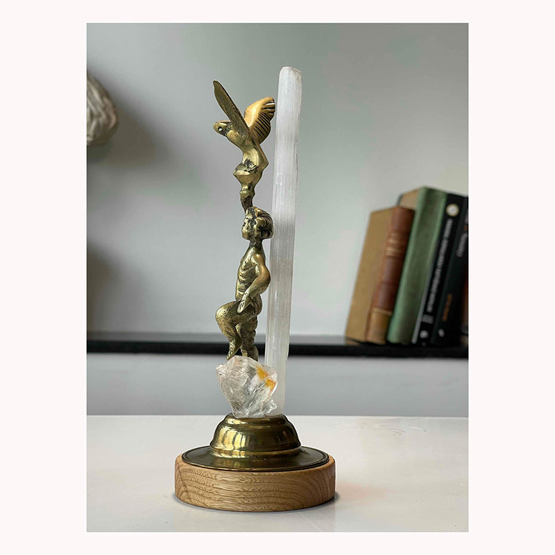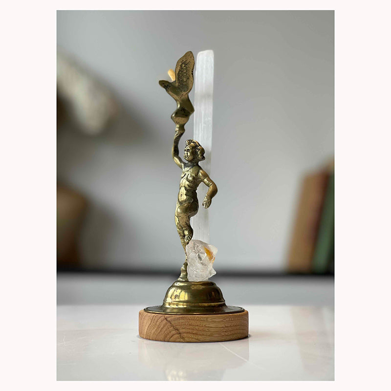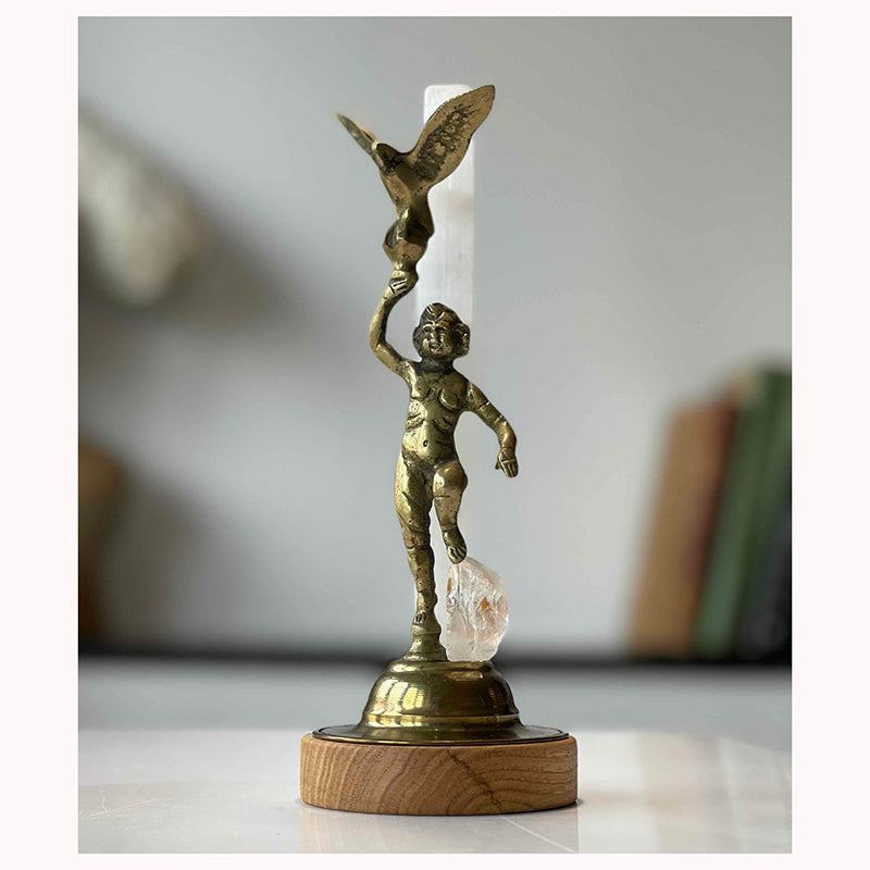 Ahşap kaide üzerinde elinde kuşuyla pirinç bir figür. Arkasında Selenit Kristali, ayağının altında Kristal Kuvars. Çalışma özgürleşerek zafere doğru ilerlemeyi sembolize ediyor.