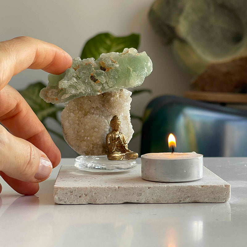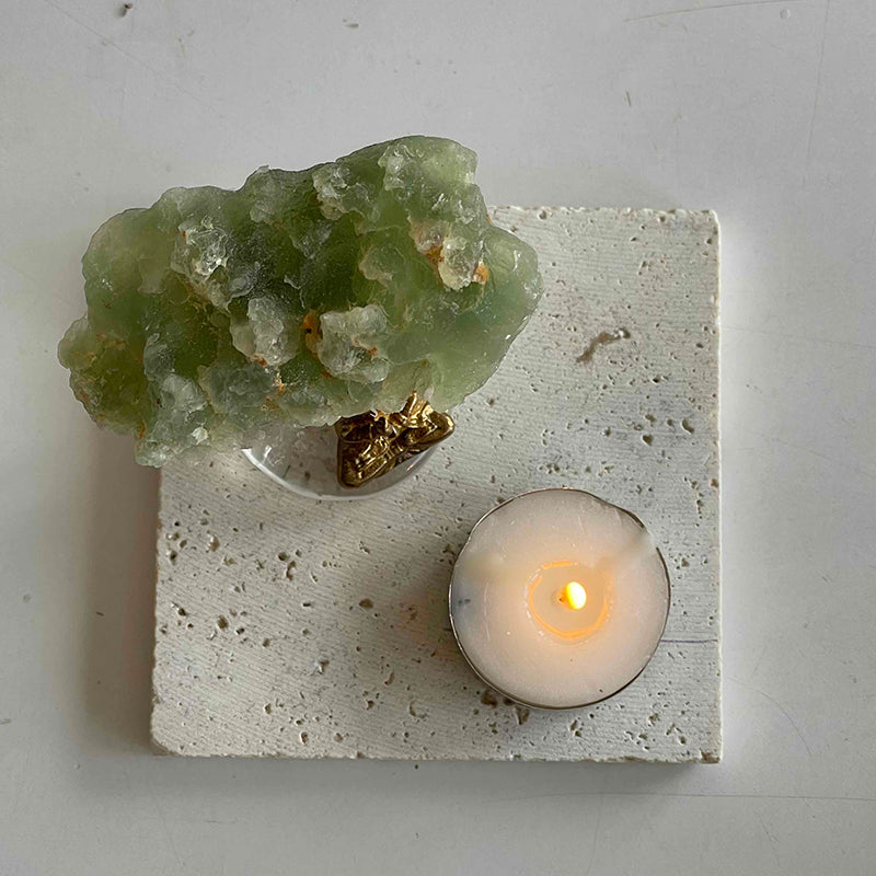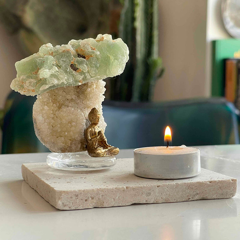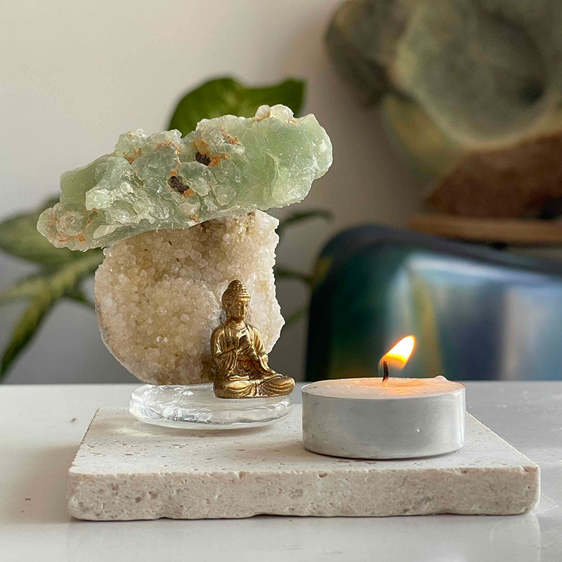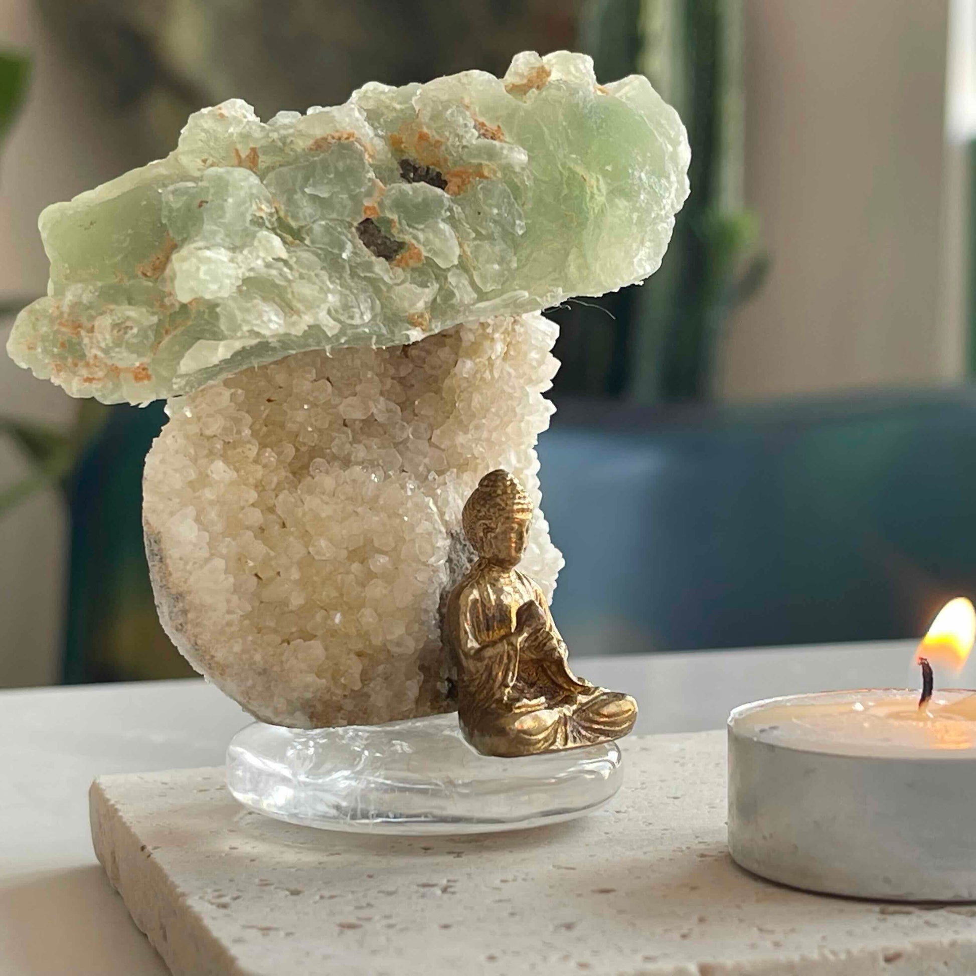 Terakota kaide üzerinde daire formunda berrak Kristal Kuvars, üzerinde ham Kristal Kuvars ve yeşil Florit. Çalışmayı tamamlayan pirinç Buda figürü Zen konseptinin tamamlayıcısı.