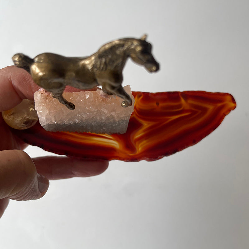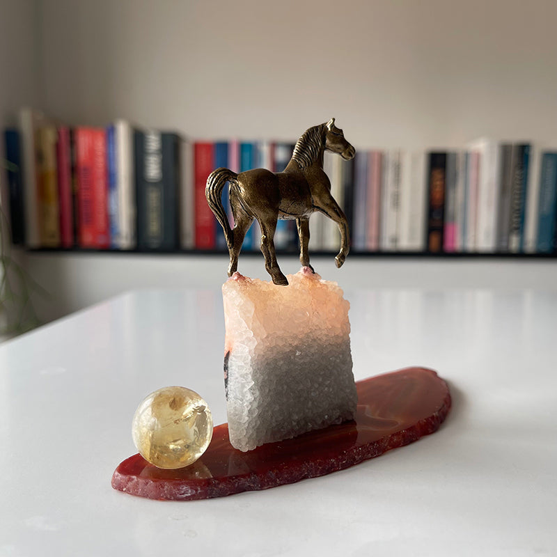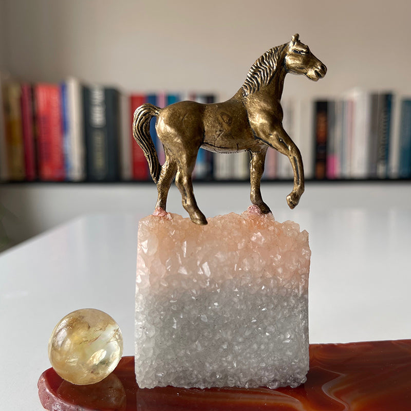 At figürü ise güç, hareketlilik ve özgürlüğü sembolize eden bir simgedir. At, enerji ve tutkuyu temsil ederken, pirinç malzeme zenginlik ve bereketin sembolüdür. Bu çalışmada kullanılan at figürü, bolluk enerjisiyle birleşerek size güçlü bir his verir ve zenginlik akışını çağırır.